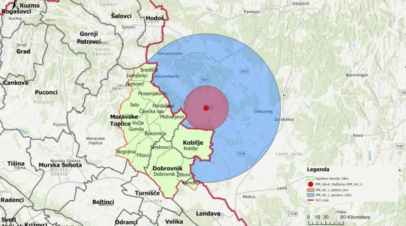 Ogroženo območje v Sloveniji zaradi PPR na Madžarskem zajema občine in naselja:
