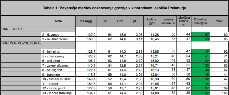 In kako kaže povprečje v Prekmurju? (Stolpec indeksa zrelosti po Benvegninovi metodi je obarvan z zeleno)